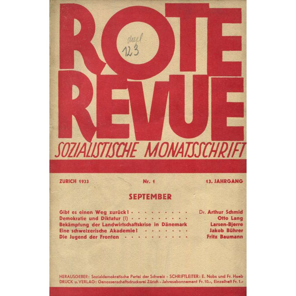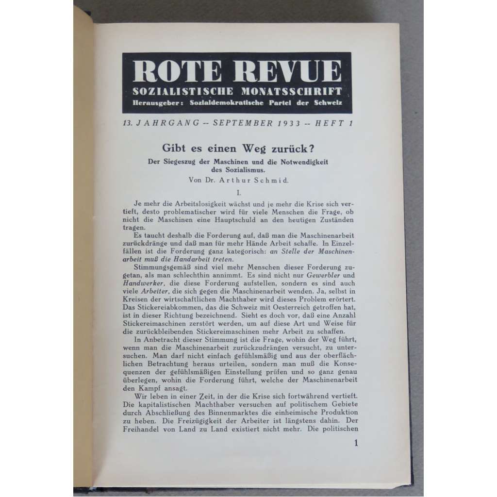 Kompletní 13. ročník časopisu/měsíčníku vydávaného Sociálně demokratickou stranou Švýcarska. Svazek obsahuje čísla od září 1933 (č. 1) do srpna 1934 (č. 12); žádné číslo nechybí. V posledním čísle je vzadu obsah celého ročníku.