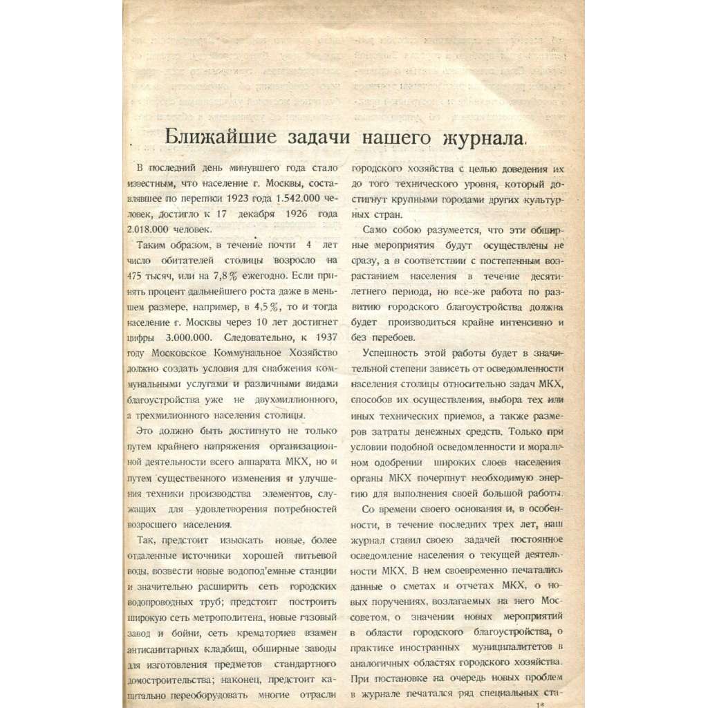 Dvojčíslo časopisu vydávaného Moskevskými komunálními službami z roku 1927. Jednotlivé příspěvky se věnují v prvé řadě urbanismu v SSSR, resp. městskému plánování v Moskvě, ale několik článků pojednává také o zkušenostech z jiných světových metropolí (Berlín, Vídeň, Paříž, New York). Viz naskenovaný obsah. Ilustrováno fotografiemi, grafy atd.