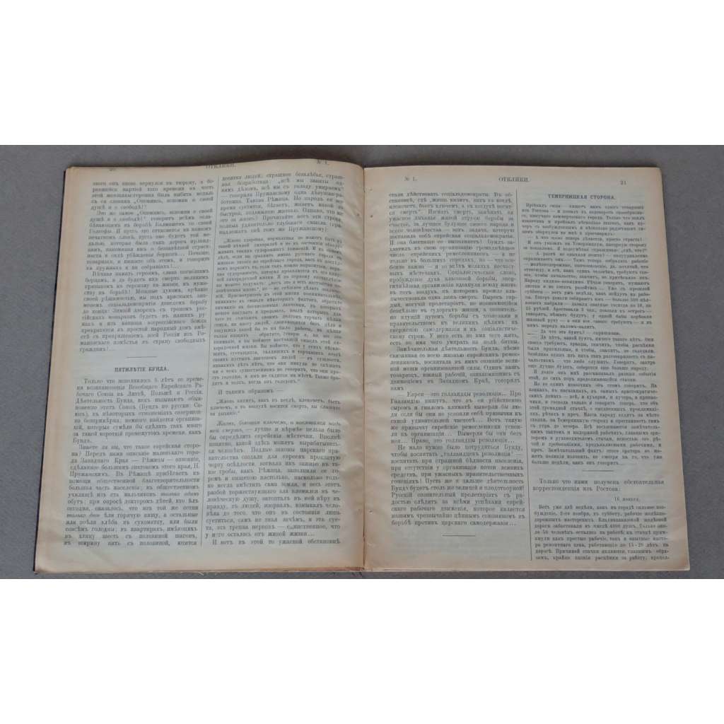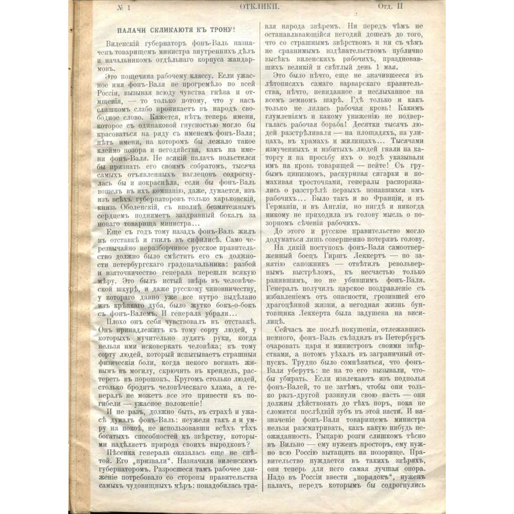 Asi jediné publikované číslo časopisu "Otkliki", které bylo vydáno malou ruskou sociálnědemokratickou skupinou v ženevském exilu (nesla název Revolučně-socialistická skupina Svoboda). Číslo je rozděleno na dva samostatně paginované oddíly, druhý je zjevně nekompletní a má pouze 16 stran (nelze určit kolik stran chybí). Velmi vzácná publikace, jen velmi zřídka se vyskytující v knihovnách.