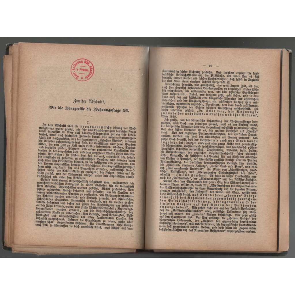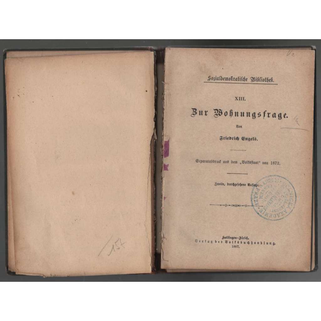 Edice Sozialdemokratische Bibliothek č. XIII, druhé upravené vydání. Samostatný výtisk z časopisu„Volksstaat“ z roku 1872, série článků na téma řešení bytové otázky, rozvoj velkoměst, nedostatek bytů, dělnické byty, vlastnictví bytů