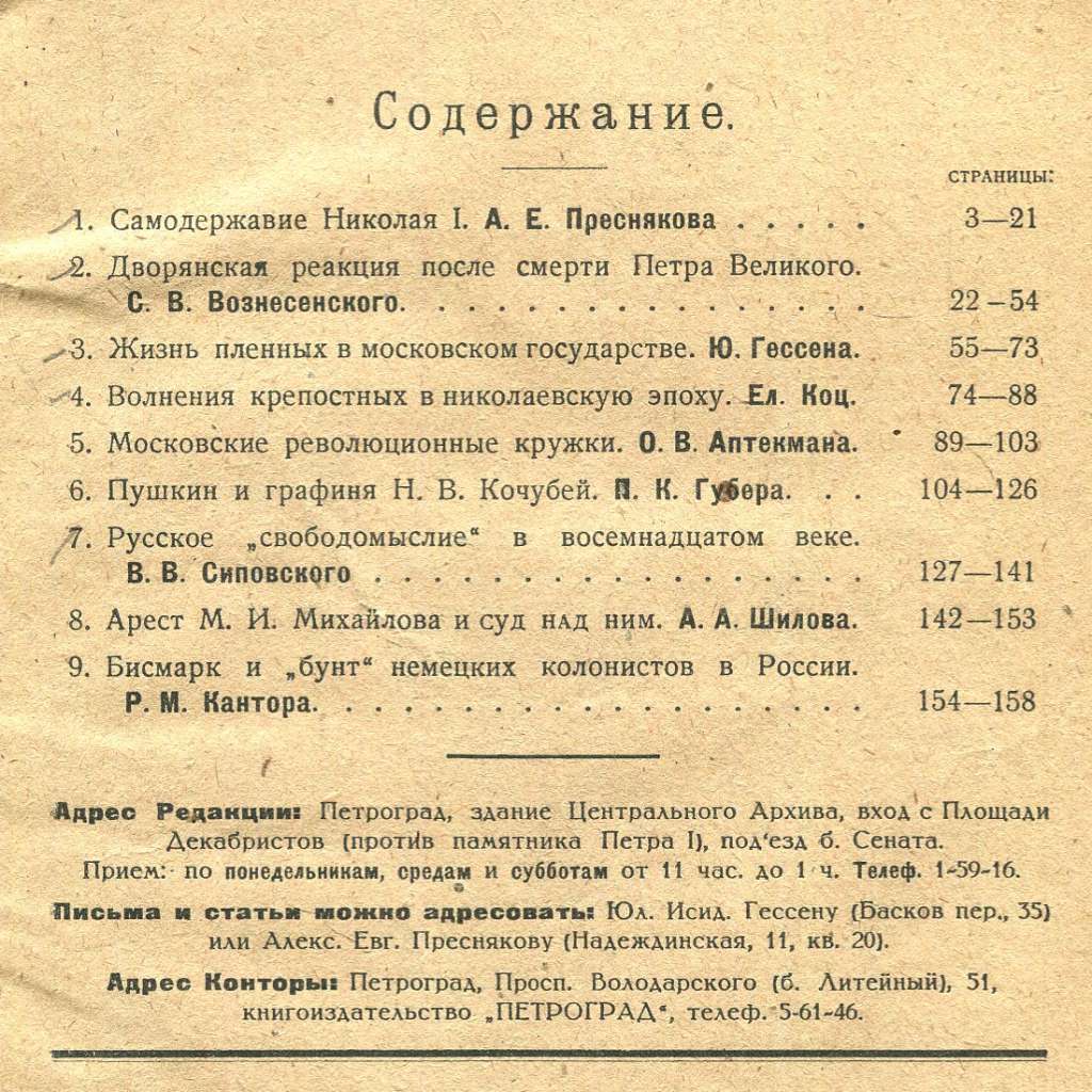 Druhé číslo periodického sborníku vydávaného v sovětském Rusku skupinou historiků významných již za carského režimu (Gessen byl průkopnickým historikem ruského židovstva, Platonov dokonce učil carovy děti). Viz naskenovaný obsah.