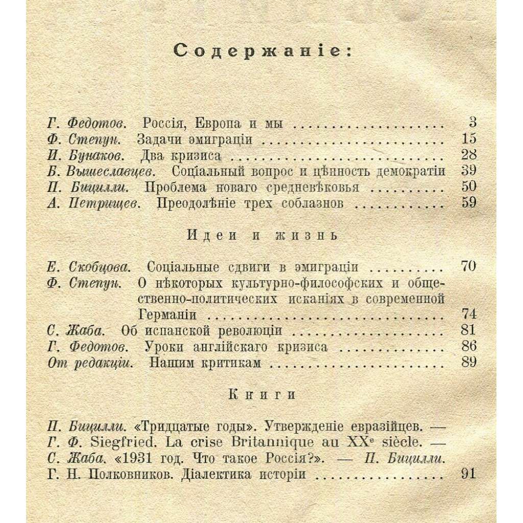 Druhé číslo ruského exilového časopisu, jehož redaktory i přispěvateli byli přední ruští intelektuálové Bunakov-Fondaminskij, Stěpun a Fedotov; toto číslo vyšlo roku 1932. Viz naskenovaný obsah. Mezi lety 1931 až 1939 vyšlo celkem 14 čísel časopisu (číslování bylo průběžné).