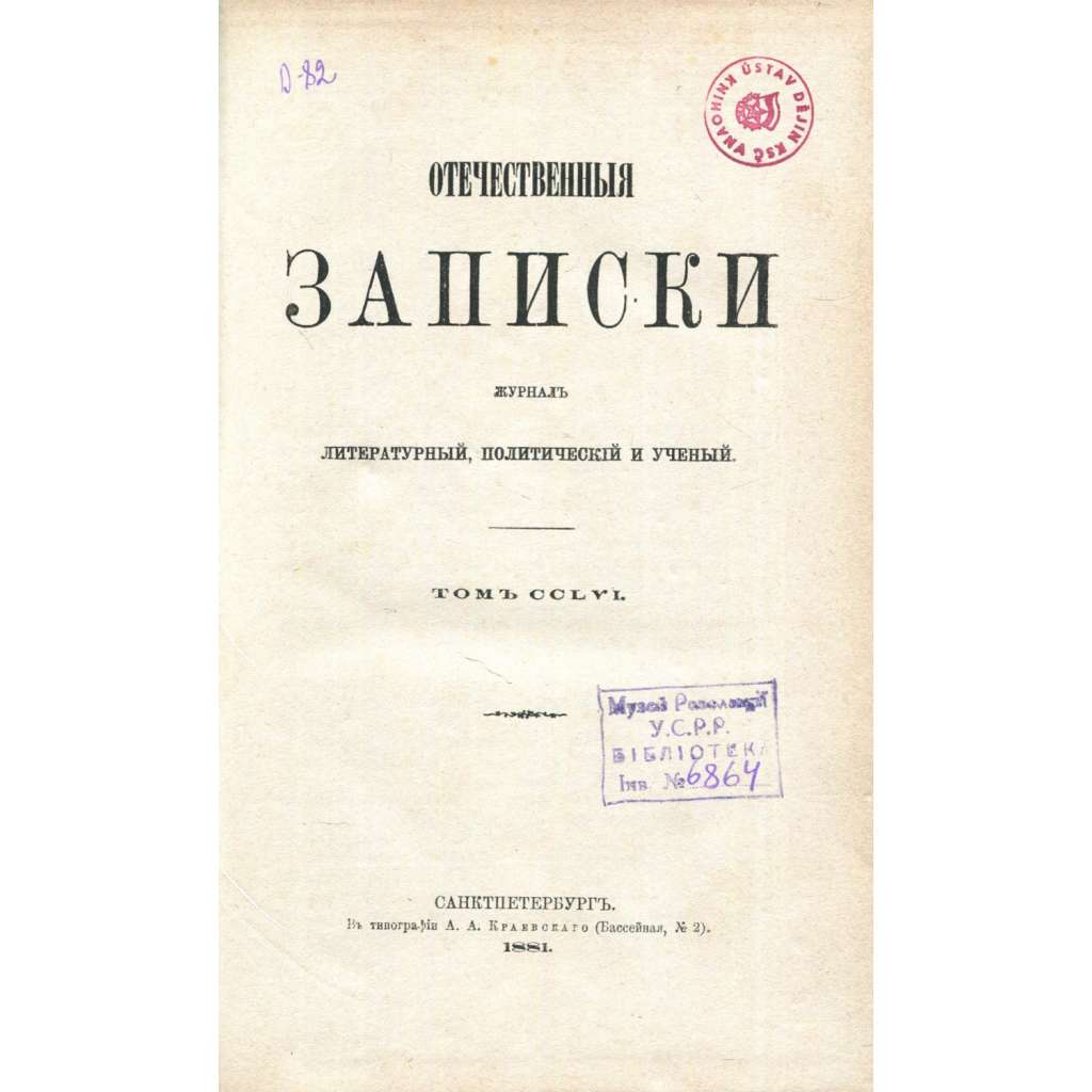 Dvě čísla významného ruského literárního a politického časopisu, jehož šéfredaktorem byl proslulý spisovatel Michail Saltykov-Ščedrin (1826–1889). Jde o kompletní svazek 256, který je tvořen čísly 5 a 6 z května a června 1881 (ročník je tvořen 6 samostatně stránkovanými svazky po dvou číslech). Vevázána je i samostatně stránkovaná politická příloha, první část novely "Dobryj čelovek" (s. 1–48) a obsah obou čísel.