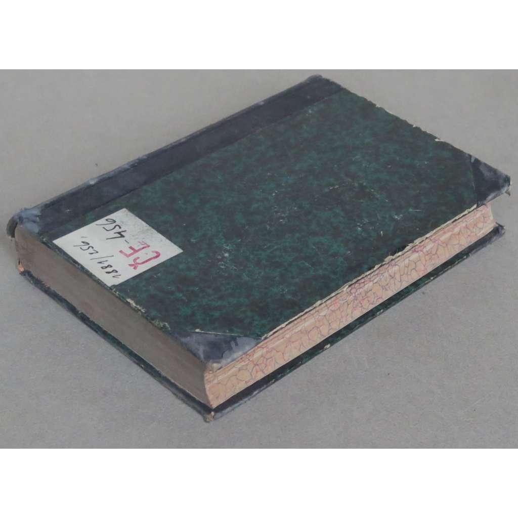 Stav knihy: Dobrý stav; desky opotřebované, kůže na hřbetu s drobnou ztrátou, rohy desek trochu naražené a odřené, předsádky s pár otisky, razítky a signaturou, na několika stranách jsou další razítka, na pár stránkách jsou žluté skvrnky od stáří.