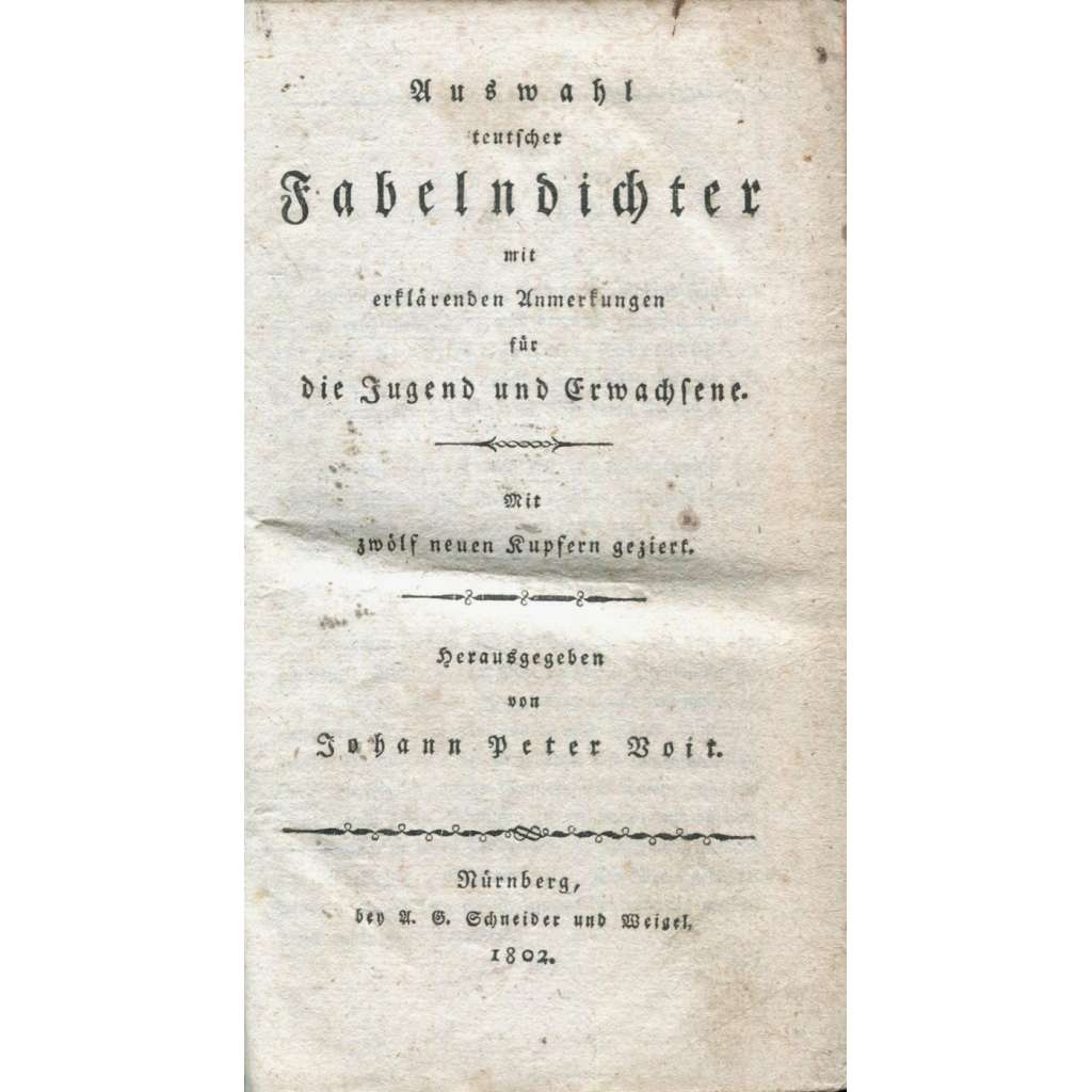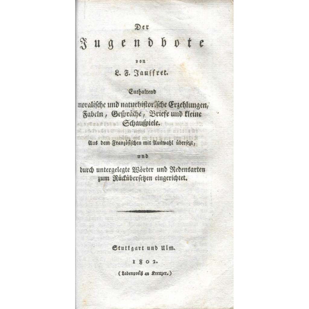 Celé tituly a podtituly: "Auswahl teutscher Fabelndichter mit erklärenden Anmerkungen für die Jugend und Erwachsene"; "Der Jugendbote von L. F. Jauffret. Enthaltend moralische und naturhistorische Erzehlungen, Fabeln, Gespräche, Briefe und kleine Schauspiele".