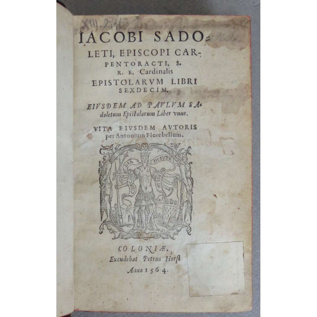 Celý titul a podtituly: "Iacobi Sadoleti, Episcopi Carpentoracti, S. R. E. Cardinalis, Epistolarum libri sexdecim. Eiusdem ad Paulum Sadoletum Epistolarum Liber unus. Vita eiusdem autoris per Antonium Florebellum." (Šestnáct knih dopisů Jacoba Sadoleta, biskupa z Carpentras a kardinála římské Církve svaté. Jedna kniha dopisů téhož autora Paulu Sadoletovi. Život téhož autora od Antonia Florebella.)