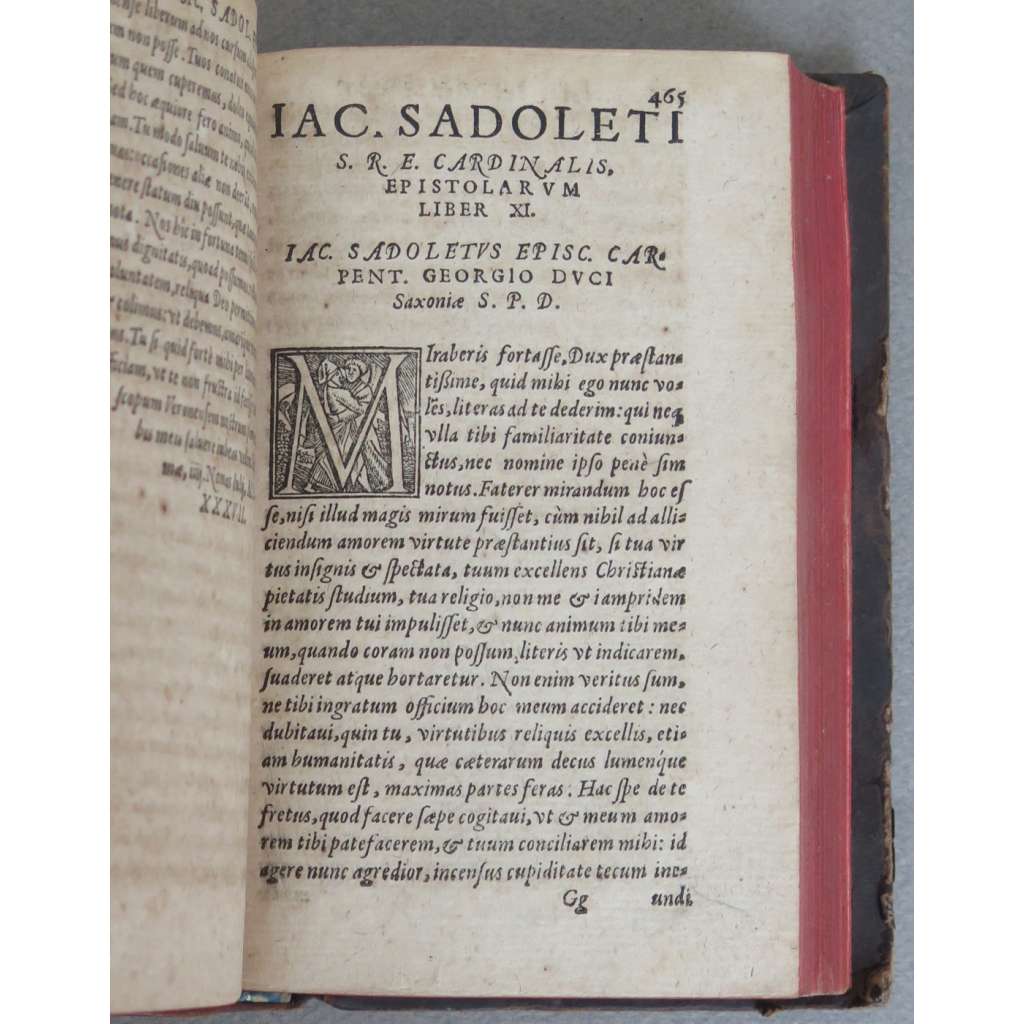 Dopisy italského humanisty Jacopa Sadoleta (1477–1547) různým adresátům; doplněno životopisem autora od Antonia Fiordibella (latinsky Antonius Florebellus) a jmenným rejstříkem. Kompletní a dobře zachovalý výtisk.