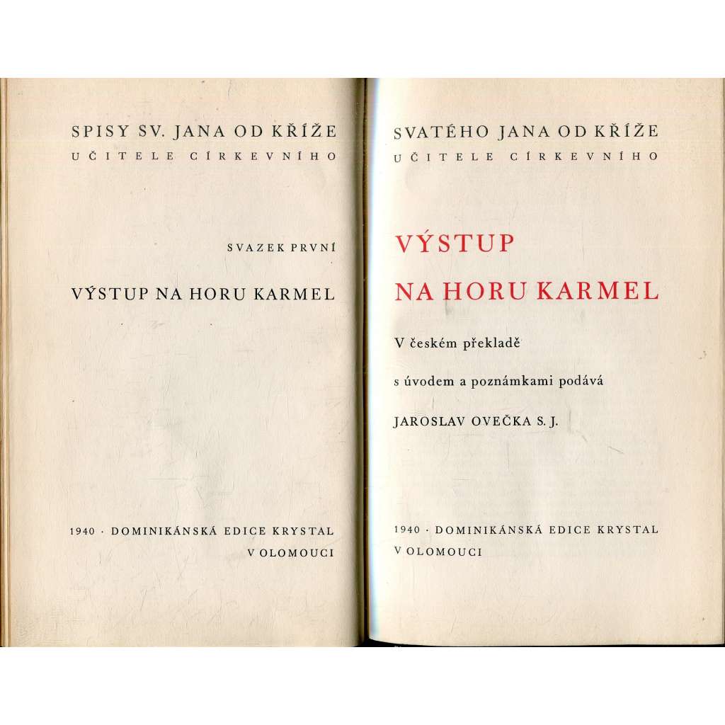 Vydání: Spisy sv. Jana od kříže, sv. I. Dominikánská edice Krystal, Olomouc 1940. Poloplátěná vazba, 413 stran, rozměry: 15 x 23 cm.
