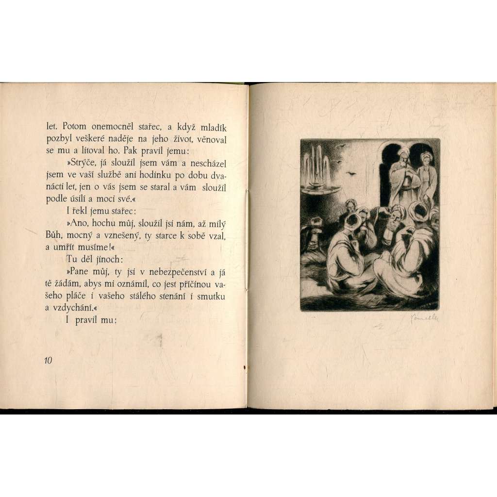 Příběh o jinochu a smutných starcích. Z arabského originálu Tisíce a jedné noci přeložil Karel Šafář. Třemi suchými jehlami a dvěma kresbami vyzdobil František Pavelka, signováno.