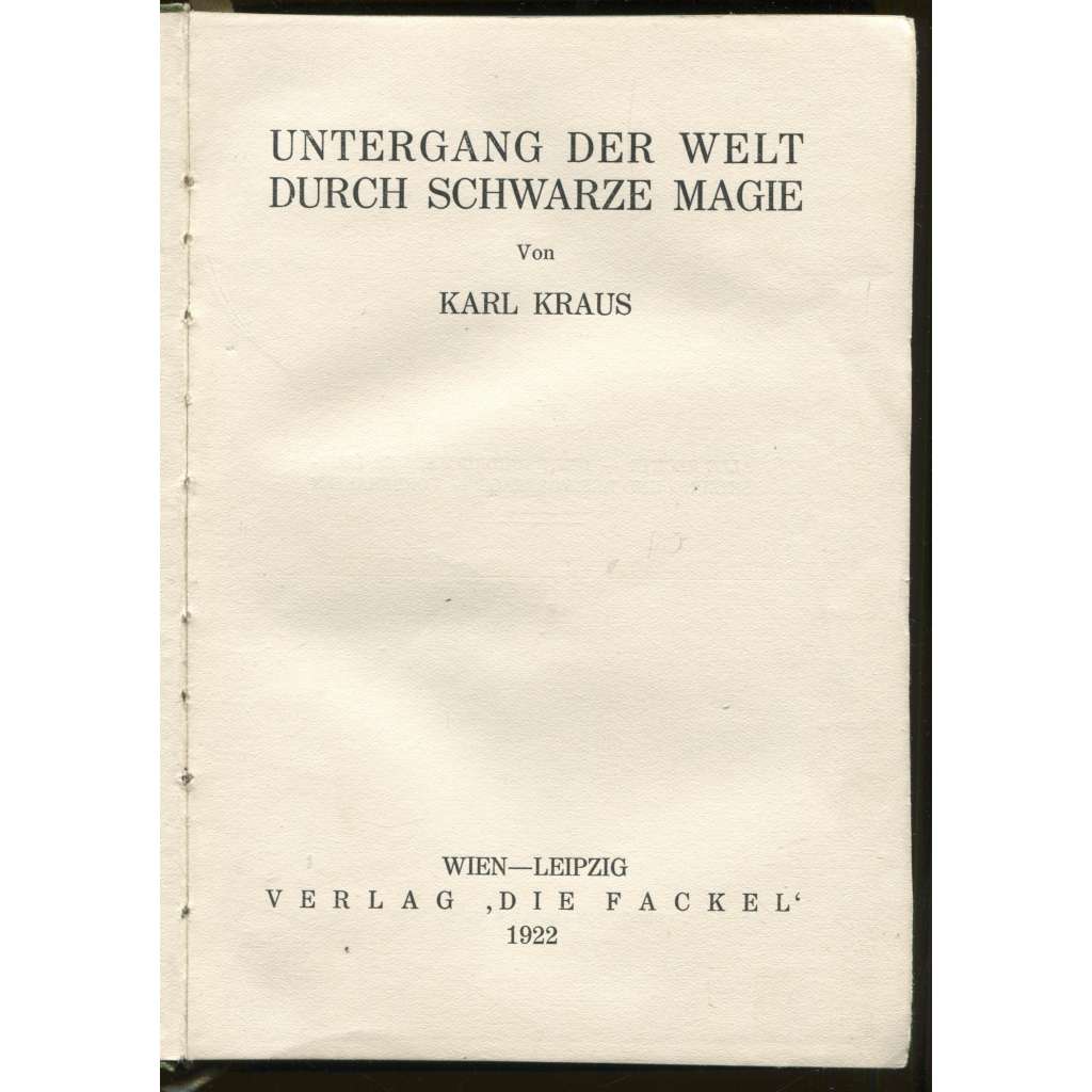 Vydání: Wien - Leipzig: Verlag "Die Fackel" 1922, první vydání, celoplátěná vazba s titulem na přední desce a hřbetu, 496 stran, 8° (13,5 x 19 cm)