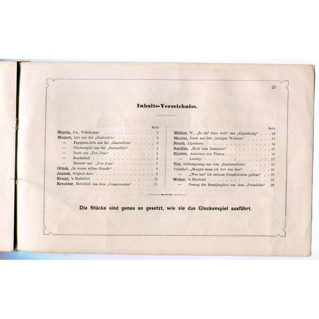 Obsahuje noty v úpravě pro klavír pro dvě ruce ke 22 písním a skladbám, které v 2. polovině 19. století hrála Salcburská zvonkohra.