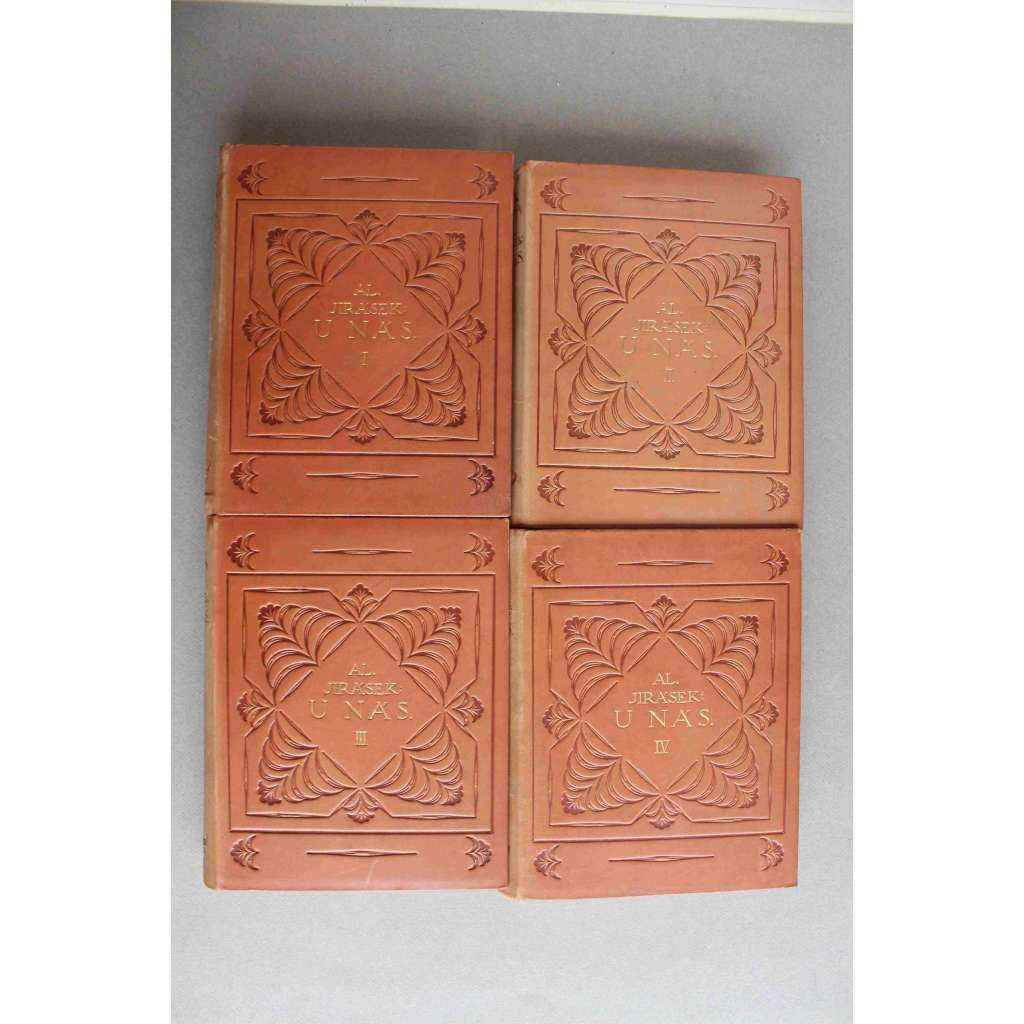 U nás. Nová kronika 4 díly (historický román, národní obrození, Náchod, Hronov; ilustrace Adolf Kašpar; celokožená vazba - vazba kůže)