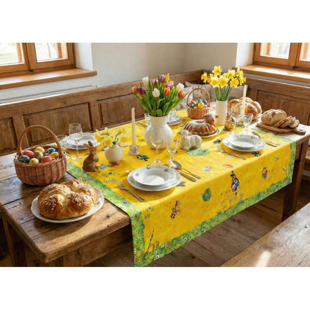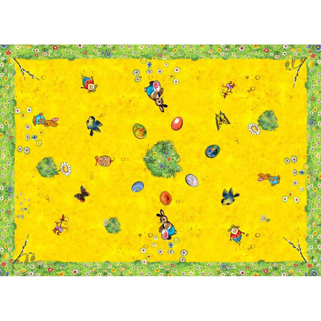 Velikonoční ubrus s ilustracemi z dětské knihy Velikonoční pohádka od Vojtěcha Kubašty.