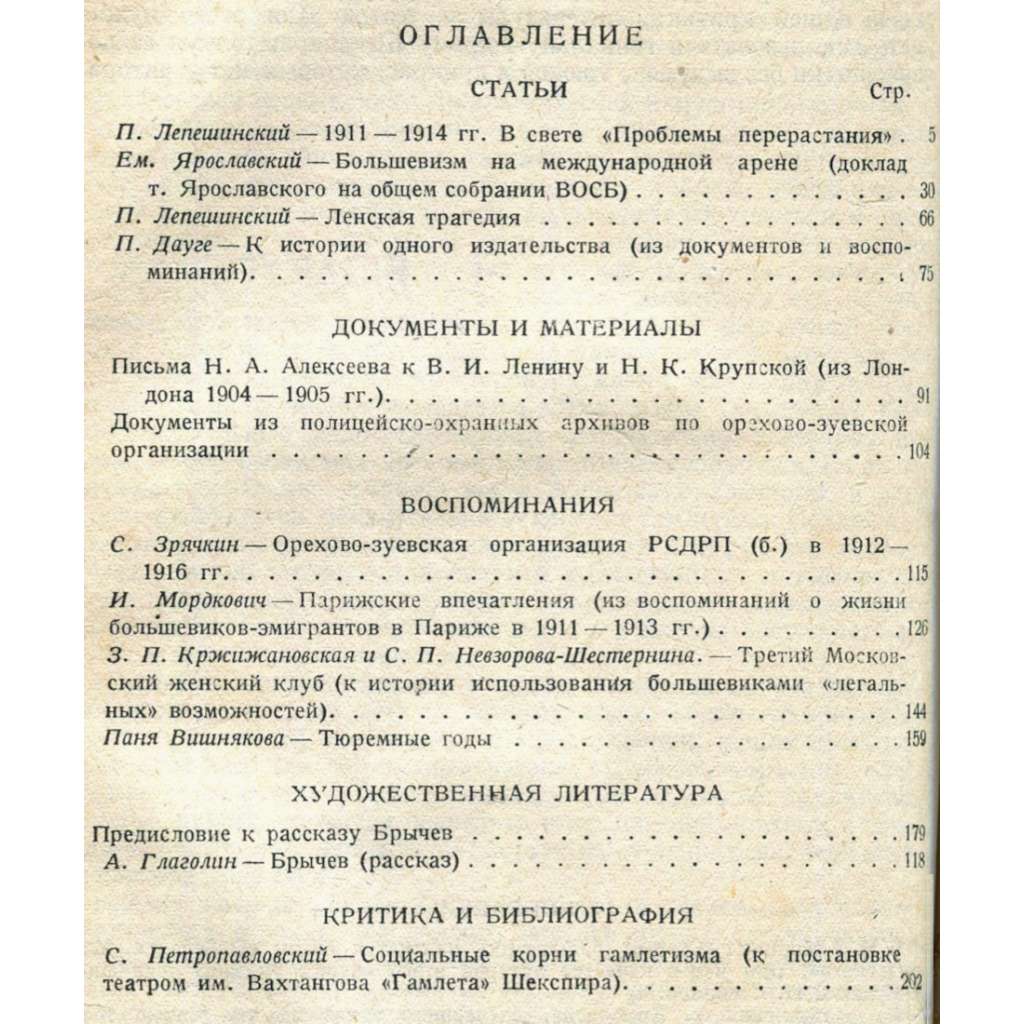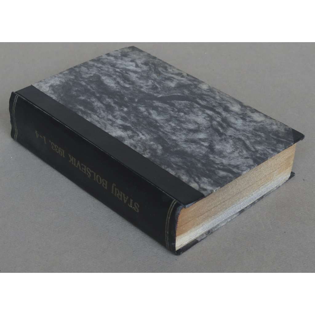 Tři navazující čísla sovětského historického časopisu. Viz naskenovaný obsah jednoho z čísel. Ve svazku je vevázáno číslo 3 v průběžném číslování a navazující čísla 4 (1. číslo ročníku 1933) a 5 (2. číslo ročníku 1933). Na toto č. 5 (2) navazovalo třetí číslo ročníku 1933, v průběžném číslování č. 6.