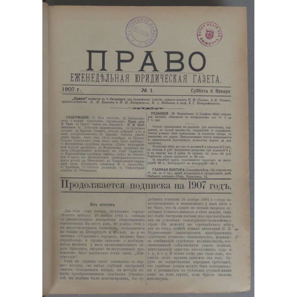 Kompletní ročník politicky významného ruského právnického týdeníku, mezi jehož editory patřil otec spisovatele Nabokova. Časopis měl blízko ke Konstitučně demokratické straně (tzv. Kadetům). Svazek obsahuje všechna čísla od 6. 1. (č. 1) do 30. 12. 1907 (č. 52). Rejstřík je vevázán.