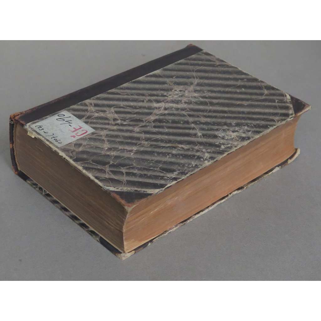 Stav knihy: Dobrý stav; desky opotřebované, kůže trochu odřená, ořízka zažloutlá, spoje mezi deskami a knižním blokem prasklé (vše ale drží pohromadě), na předsádkách jsou razítka a signatury, na stránkách je pár razítek, cca 10 listů má trochu pomačkané rohy, pár listů s drobným natržením.