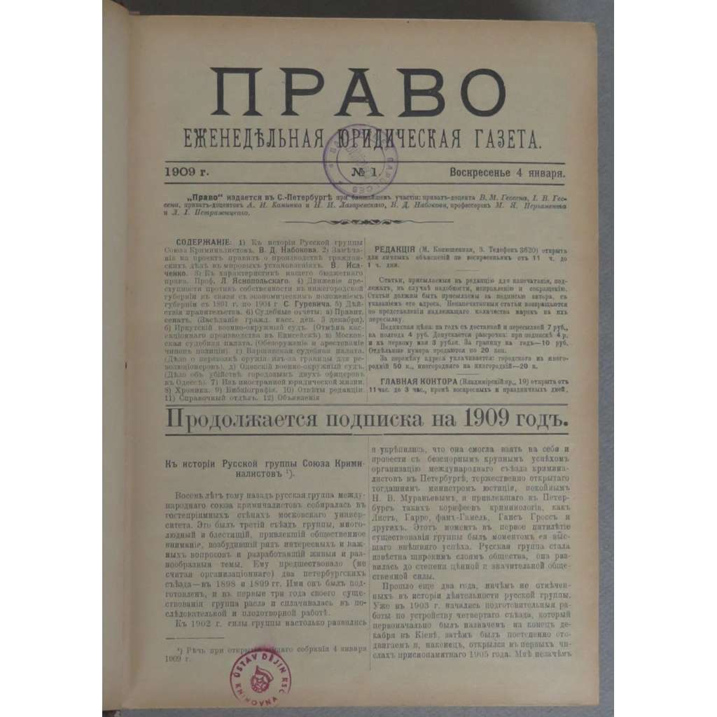 Kompletní ročník politicky významného ruského právnického týdeníku, mezi jehož editory patřil otec spisovatele Nabokova. Časopis měl blízko ke Konstitučně demokratické straně (tzv. Kadetům). Svazek obsahuje všechna čísla od 4. 1. (č. 1) do 25. 12. 1909 (č. 52). Rejstřík je vevázán.