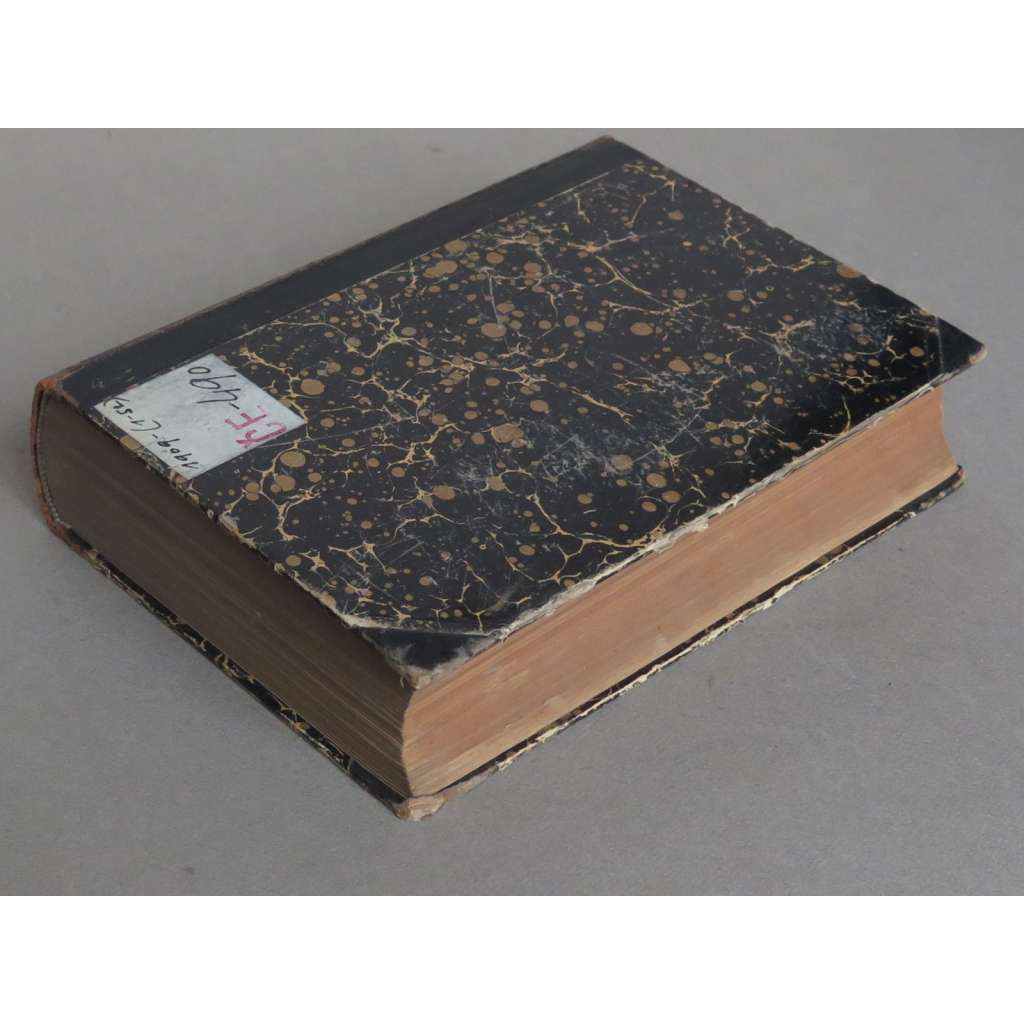 Stav knihy: Dobrý stav; desky opotřebované, kůže odřená, ořízka zažloutlá, na předsádkách jsou razítka, signatury a pár šmouh, na stránkách je pár razítek, přední spoj mezi deskami a knižním blokem má prasklinu (vše ale drží pohromadě).