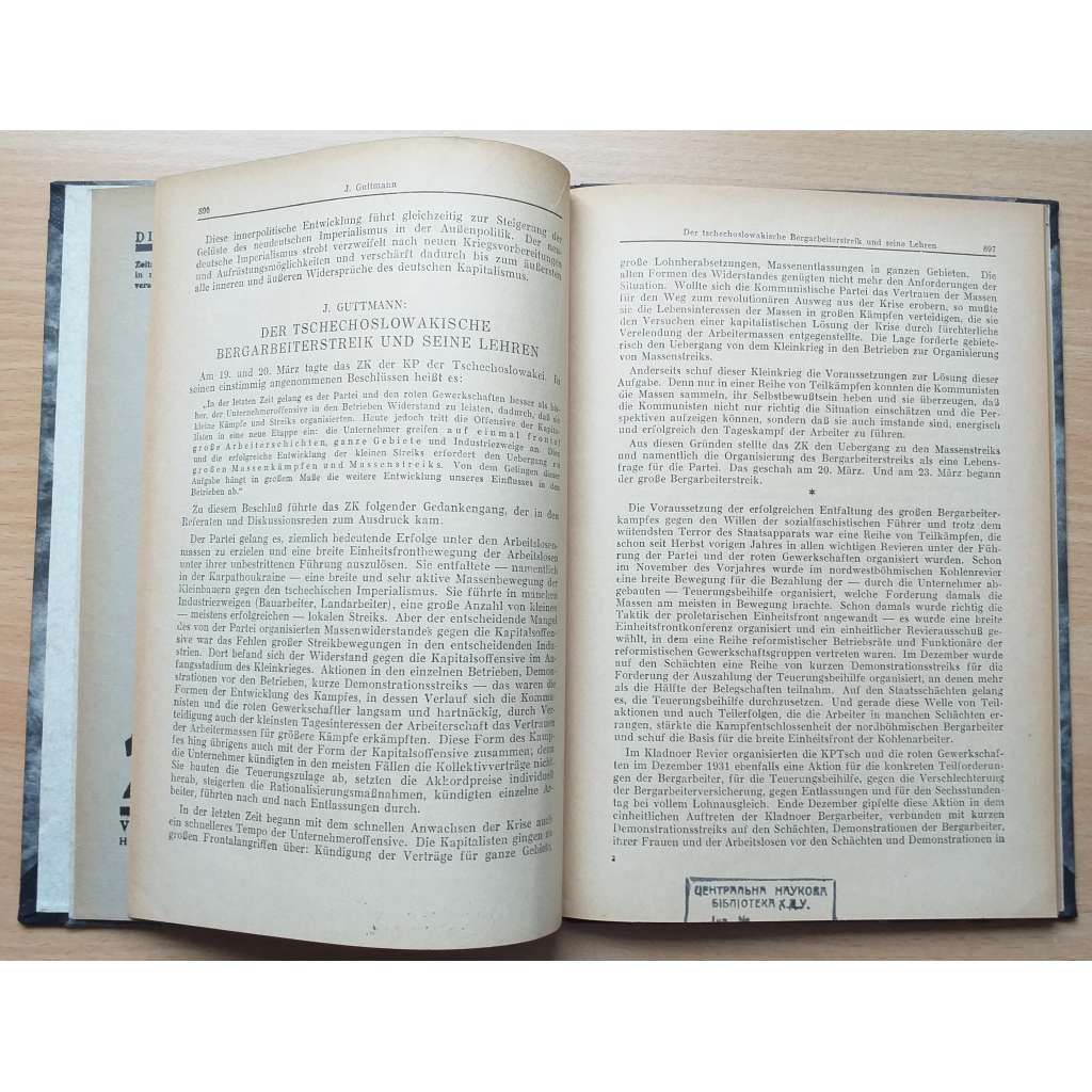 Časopis výkonného výboru Komunistické internacionály. Nové manévry sociálních demokratů, krize německého těžkého průmyslu, stávka československých horníků, boj horníků v Porúří, praxe budování strany