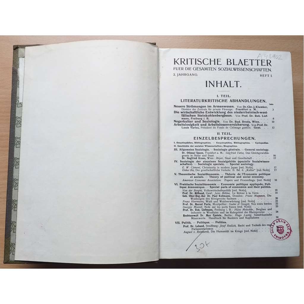 Kritische Blaetter fuer die gesamten Sozialwissenschaften; 2. Jahrgang, Hefte I.-XII. [společenské vědy]