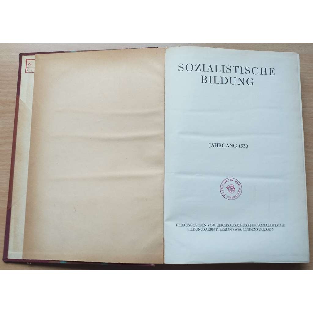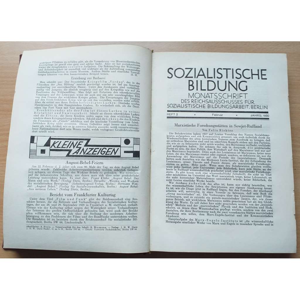 Vydání: Berlin: Reichsausschuss für sozialistische Bildungsarbeit 1930. Poloplátěná vazba se zlaceným titulem na hřbetu, VI+383 stran, 4° (16,5 x23,5 cm)