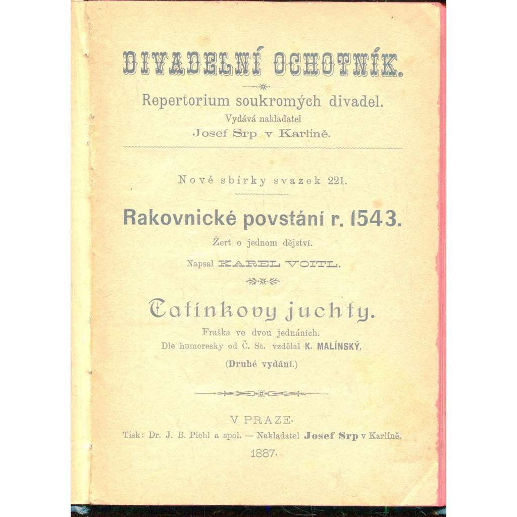 Divadelní ochotník. Repertorium soukromých divadel [divadlo, divadelní hry] Rakovnické povstání r. 143 / Tatínkovy juchty (Rakovník)