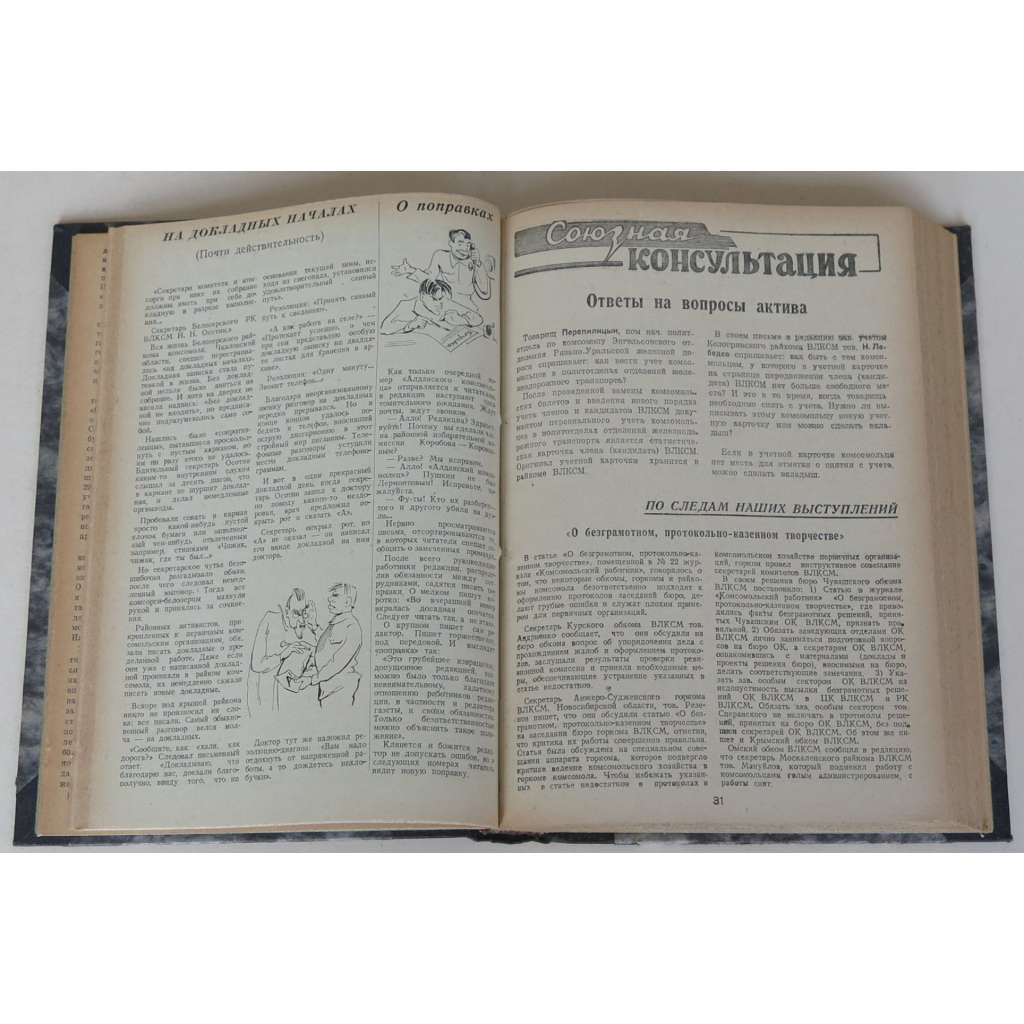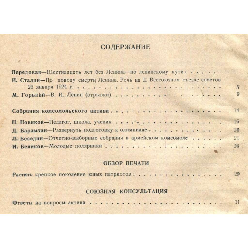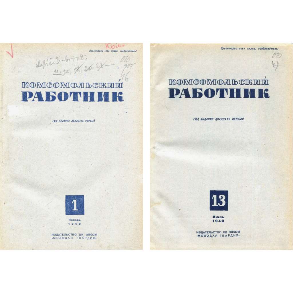 Kompletní 21. ročník sovětského časopisu/čtrnáctideníku pro komsomolské kádry; viz naskenovaný obsah čísla 1. Svazky obsahují všechna čísla od ledna (č. 1) do prosince 1940 (č. 24). Ilustrováno fotografiemi a kresbami.