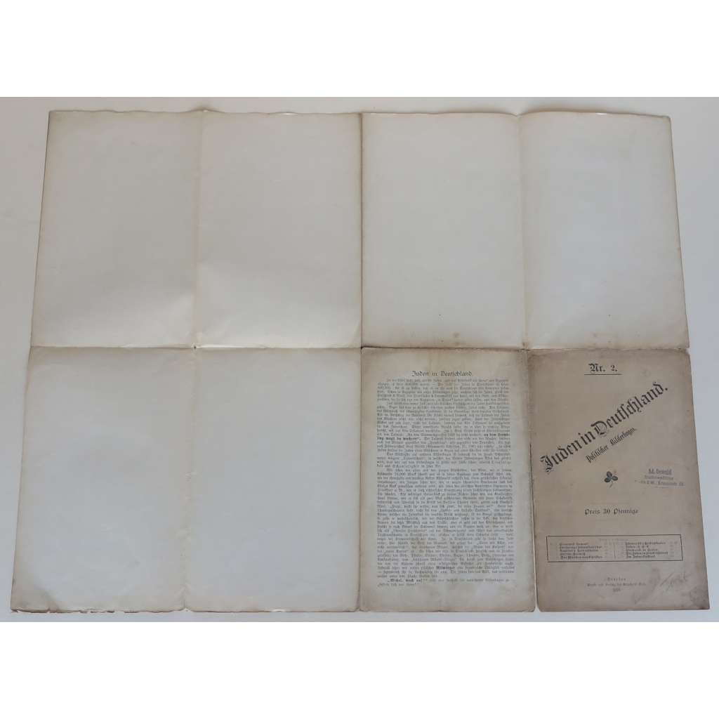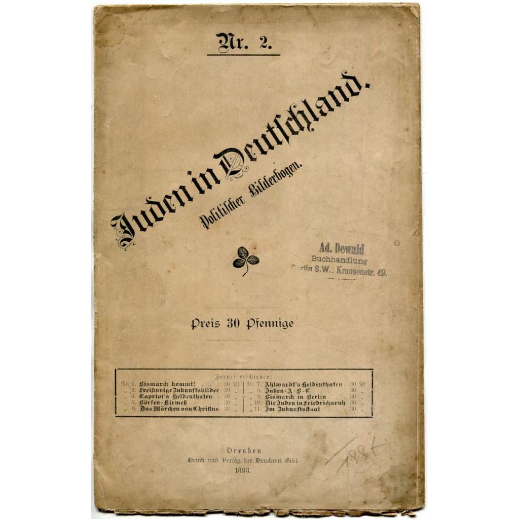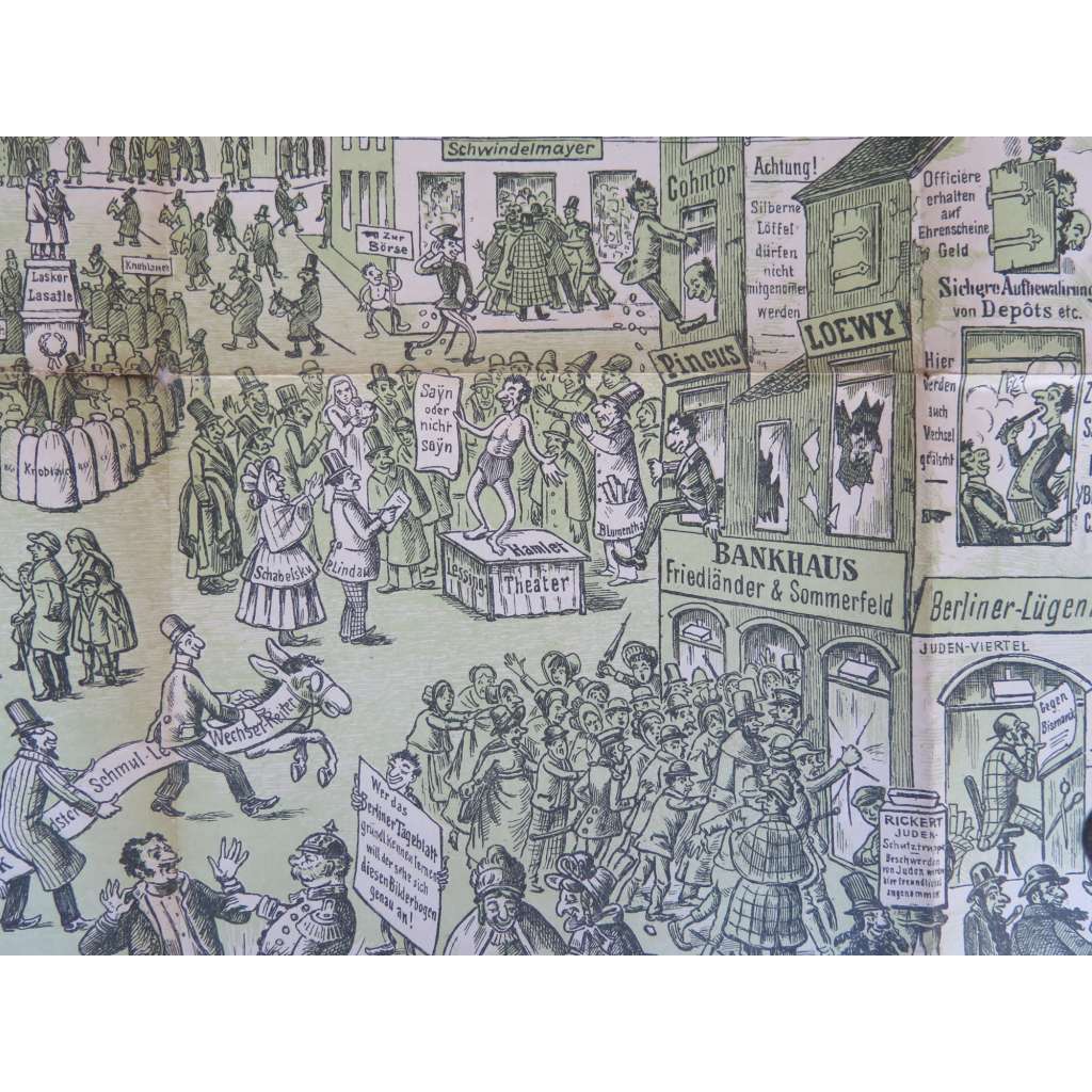 Rozkládací litografie s dvěma velkými antisemitskými karikaturami a vysvětlujícím textem na rubu. Vydáno v Drážďanech v neblaze proslulé edici "Politische Bilderbogen". Autorem karikatur a textu je Max Bewer (publikoval pod pseudonymem S. Horn).