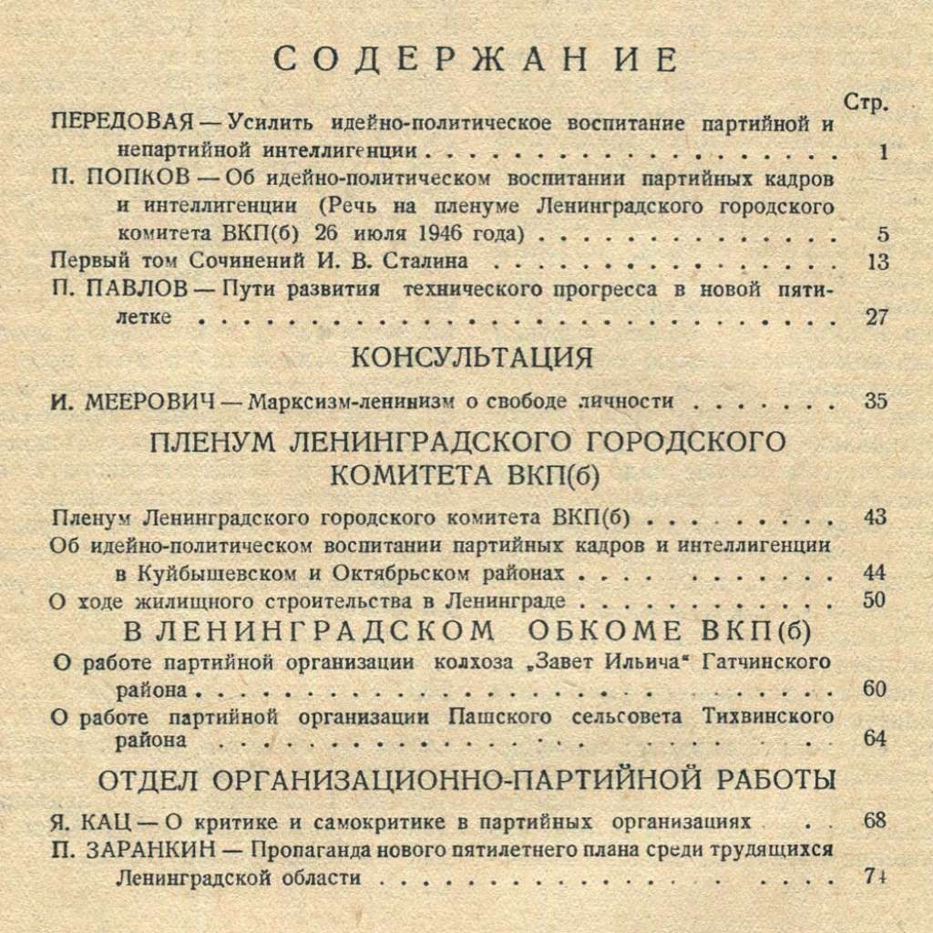 Sovětský časopis pro leningradské stranické kádry; svazek obsahuje čísla 14-15, 16, 17 a 18 z roku 1946. Viz naskenovaný obsah dvojčísla 14-15.