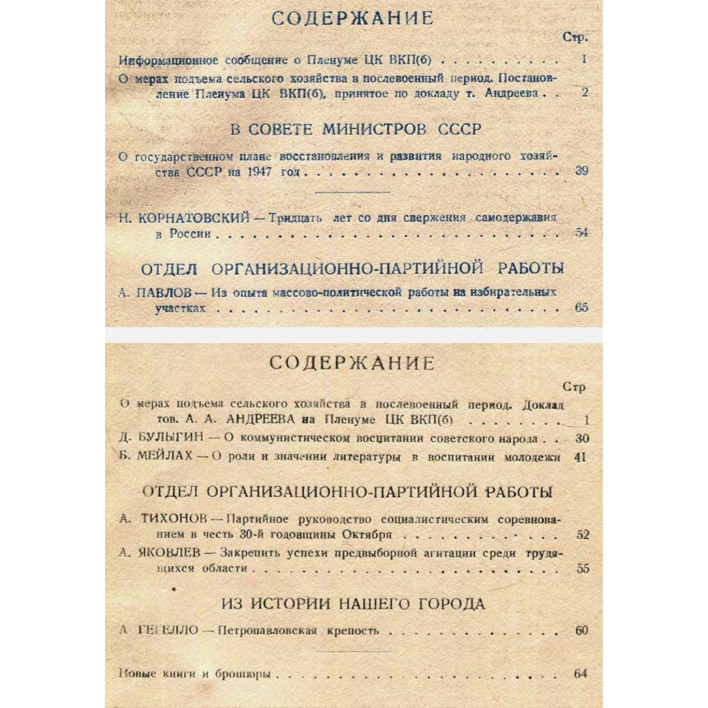 Sovětský časopis pro leningradské stranické kádry; svazek obsahuje čísla 4 a 5 z roku 1947. Viz naskenované obsahy.