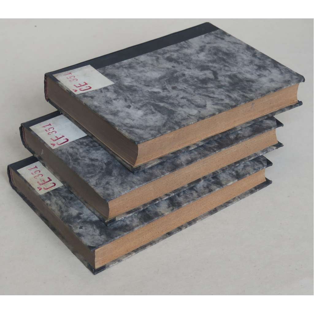 Stav knihy: Dobrý stav; desky trochu opotřebované, na zadních deskách je nalepen štítek, na předsádkách jsou razítka a signatury, původní přední obálky mírně opotřebované, jeden trochu zašpiněný, vazba prvního svazku trochu nalomená, původní obálka a dva listy odděleny z vazby, jeden list s opravenými natrženími (viz foto).