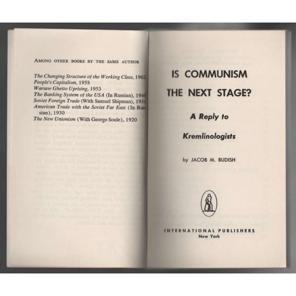 Vydání: New York: International Publishers 1965. Pův. brožovaná vazba s titulem na hřbetu a přední desce a obrázkem na deskách, 128 stran, 8° (11 x 18 cm)