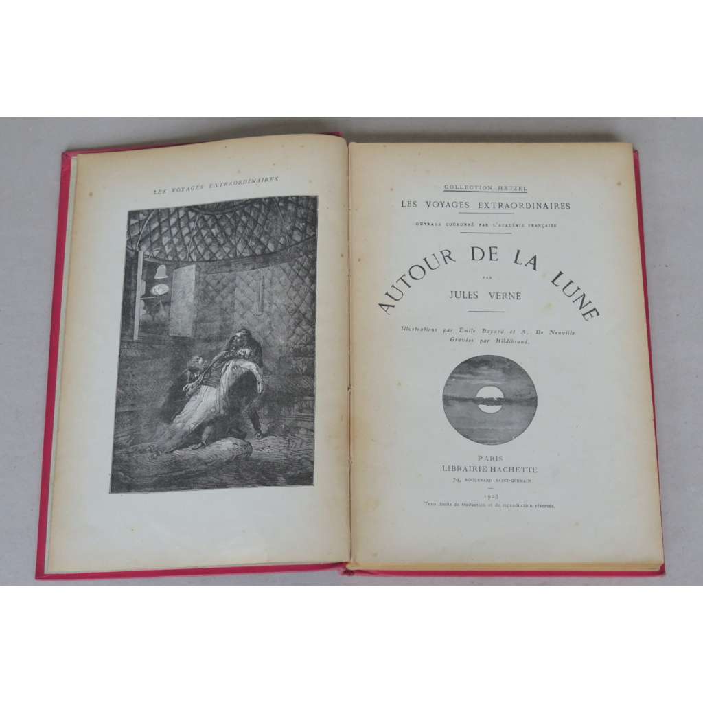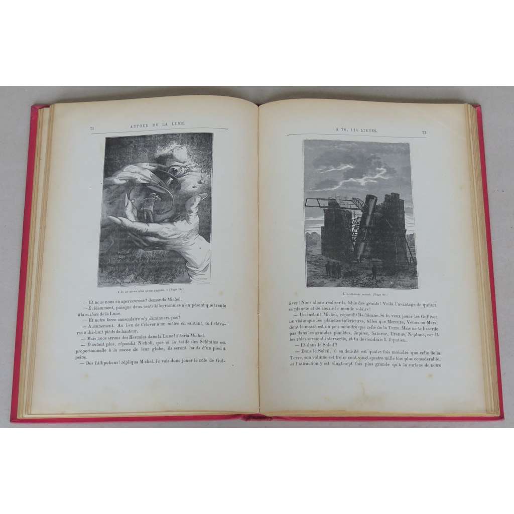 Vernova kniha "Okolo Měsíce" ve francouzském originále, vydaná v edici "Collection Hetzel: Les Voyages extraordinaires". Bohatě ilustrováno klasickými xylografiemi podle předloh Émila Bayarda a Alphonse de Neuvilla.
