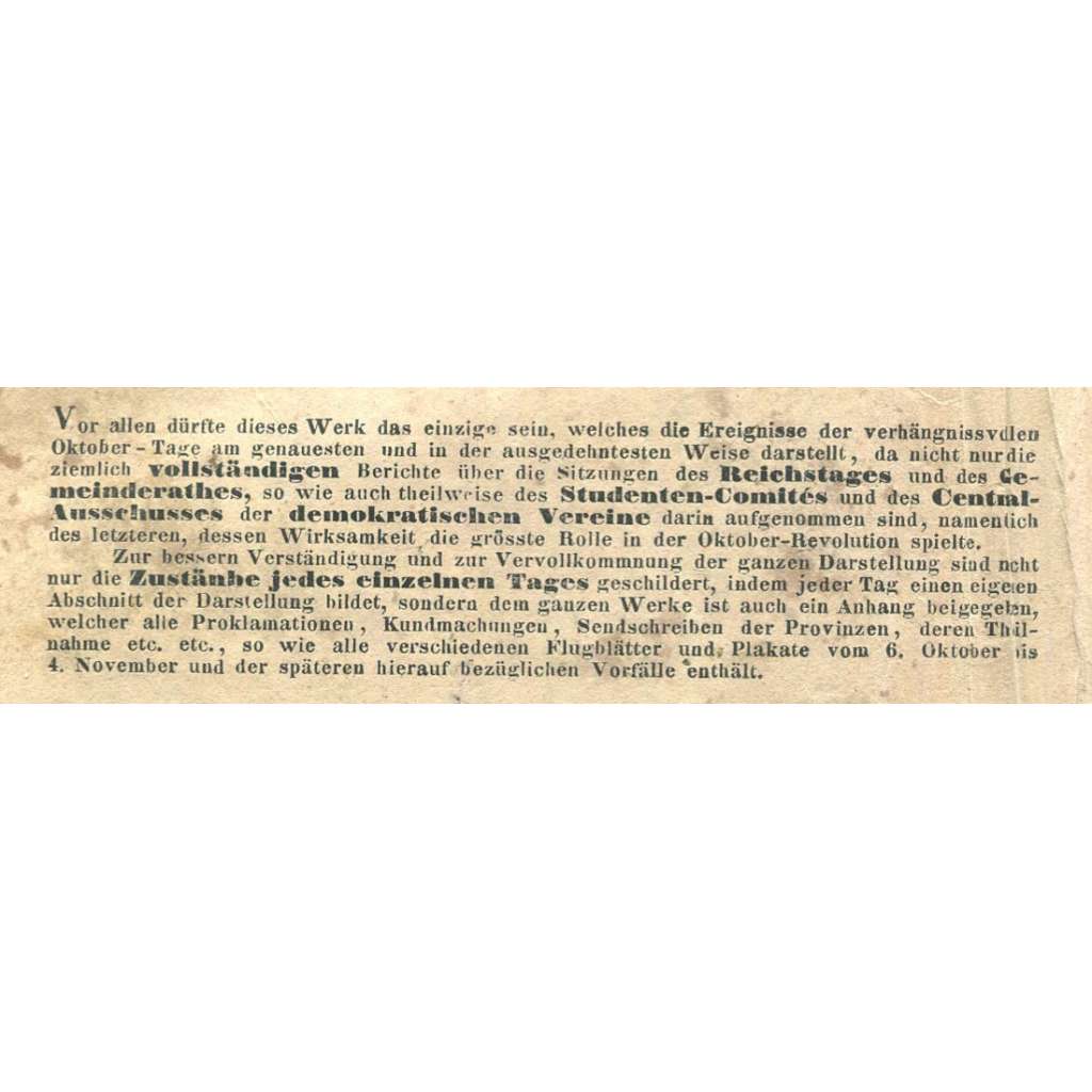 Deník Antona Schütteho (1817–1867), významného radikálního účastníka říjnové revoluce ve Vídni roku 1848; autor popisuje události od začátku října po začátek listopadu. Vydáno ještě v listopadu 1848 v Praze.