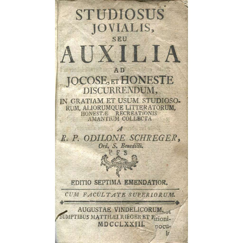 Celý titul a podtitul: "Studiosus jovialis, seu Auxilia ad jocose, et honeste discurrendum, in gratiam et usum studiosorum juvenum, aliorumque litteratorum, honestae recreationis amantium collecta" (Veselý student aneb Pomůcky k vtipnému a mravnému rozprávění, shromážděné pro potěšení a potřebu studující mládeže i dalších učenců, kteří mají rádi ušlechtilou kratochvíli.)