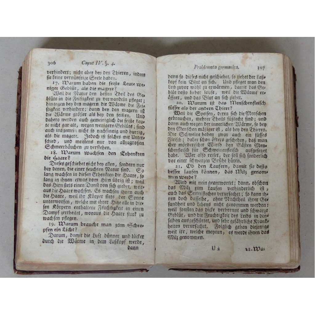 Stav knihy: Uspokojivý stav; kůže na deskách opotřebovaná a odřená, se ztrátami, na přední předsádce je pár čmáranic perem (a na obou předsádkách vlastnická poznámka), většina stránek se skvrnou od vody (viz foto), stránky občas s pár žlutými skvrnkami od stáří, zřídka se stopou po činnosti larev/hmyzu nebo s margináliemi psanými tužkou, titulní list s malou ztrátou v dolním rohu.