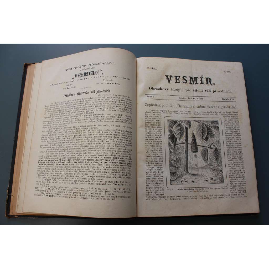 Vesmír. Obrázkový časopis 1887, roč. 16 (přírodní vědy, mj. O perlolovu na Vltavě, Černý okoun, Zvířena doby permské, Obrovské stopy z útvaru permského; polokožená vazba - vazba kůže)