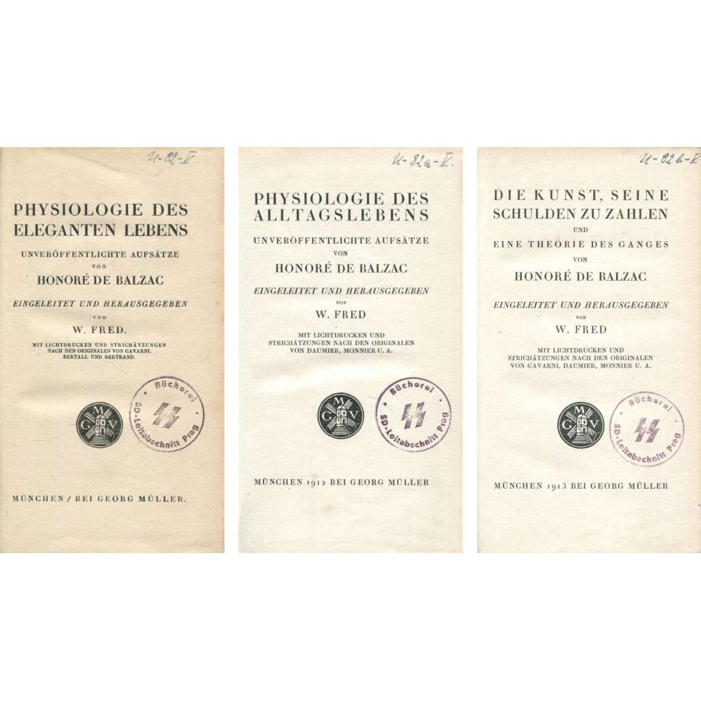 Na všech titulních stranách a předsádkách je razítko knihovny SD-Leitabschnitt Prag (Vedoucí úsek SD Praha), tj. hlavní úřadovny nacistické bezpečnostní služby Sicherheitsdienst (SD) v Protektorátu Čechy a Morava.