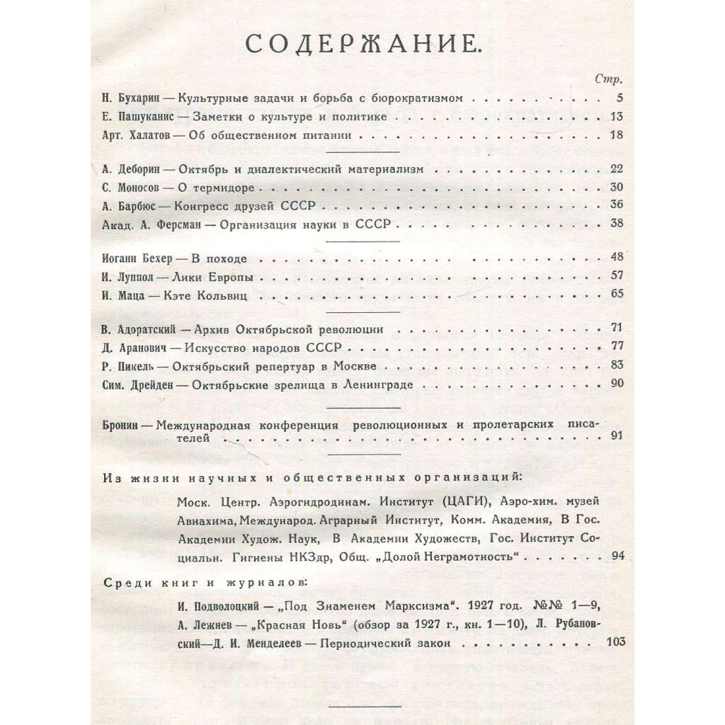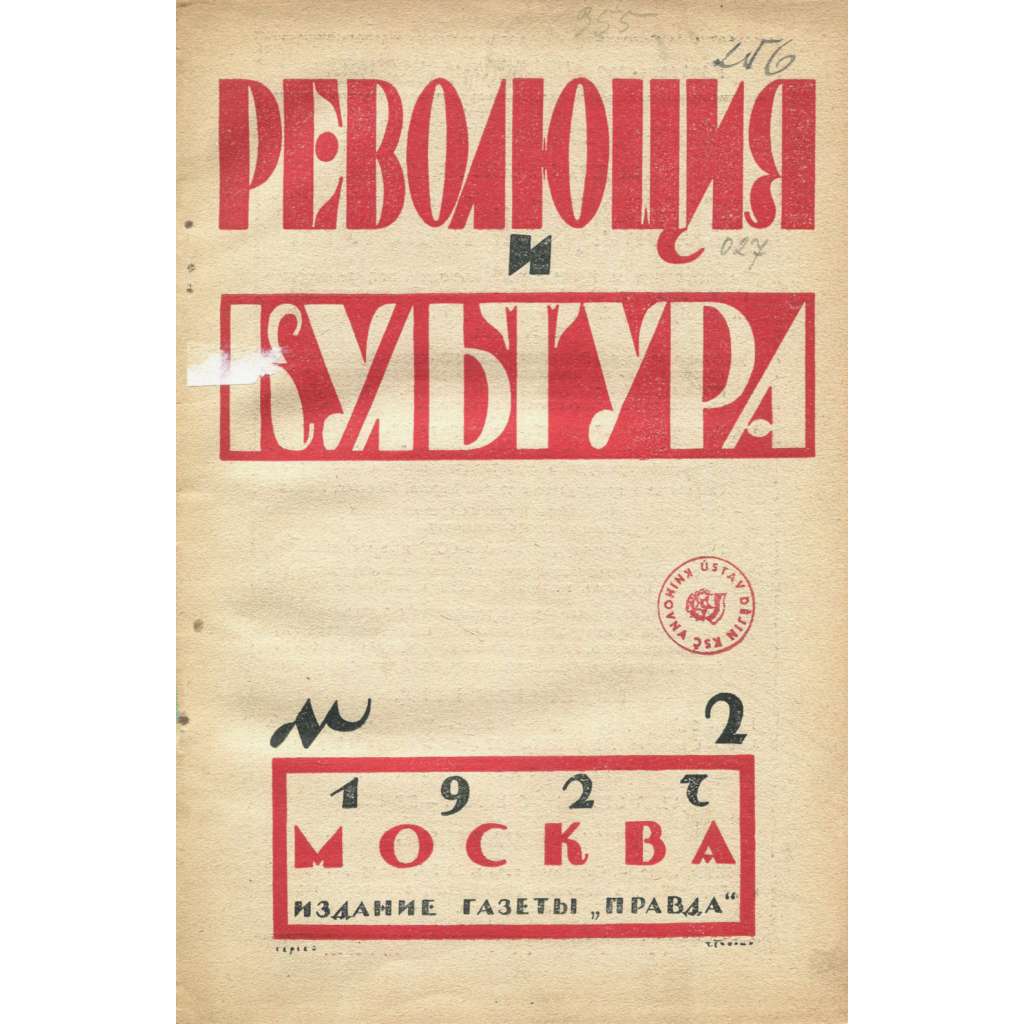 Svazek obsahuje pět čísel sovětského časopisu "Revoljucija i kultura" zaměřeného na kulturní politiku a obsahujícího příspěvky předních sovětských marxistických teoretiků. Konkrétně jde o čísla 2 a 3–4 z roku 1927, čísla 3–4 a 12 z roku 1928 a číslo 6 z roku 1929. Viz naskenovaný obsah čísla 2 z roku 1927. Doplněno přívazkem v podobě čísla 4 časopisu "Literatura i iskusstvo".