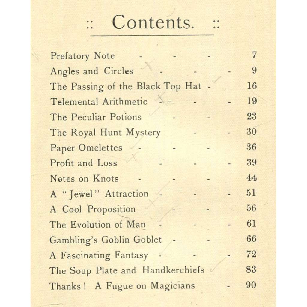 Sbírka kouzelnických triků od tehdy známých kouzelníků; viz naskenovaný obsah. Ilustrováno.