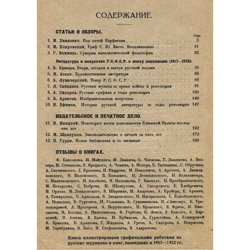 Jedno z raných čísel významného sovětského časopisu zaměřeného na literaturu, umění a literární kritiku; datováno září–říjen 1922. Viz naskenovaný obsah. Svazek obsahuje množství reprodukcí kreseb, dřevorytů a dalších modernistických či avantgardních děl; součástí je i pět barevných tabulí s třemi grafy a dvěma reprodukcemi.