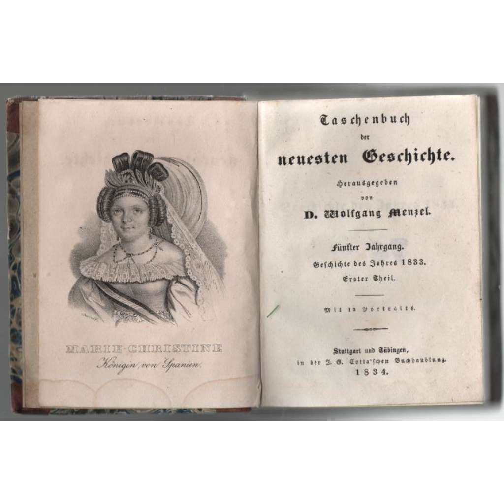Vydání: Stuttgart - Tübingen: J. G. Cotta´she Buchhandlung 1834. Pův. polokožená vazba se zlaceným titulem na hřbetu, barevnou ořízkou, štítkem knihovny na předsádce a frontispisem s portrétem, 355 stran psaných frakturou s černobílými portréty, 12° (11 x 14,5 cm)