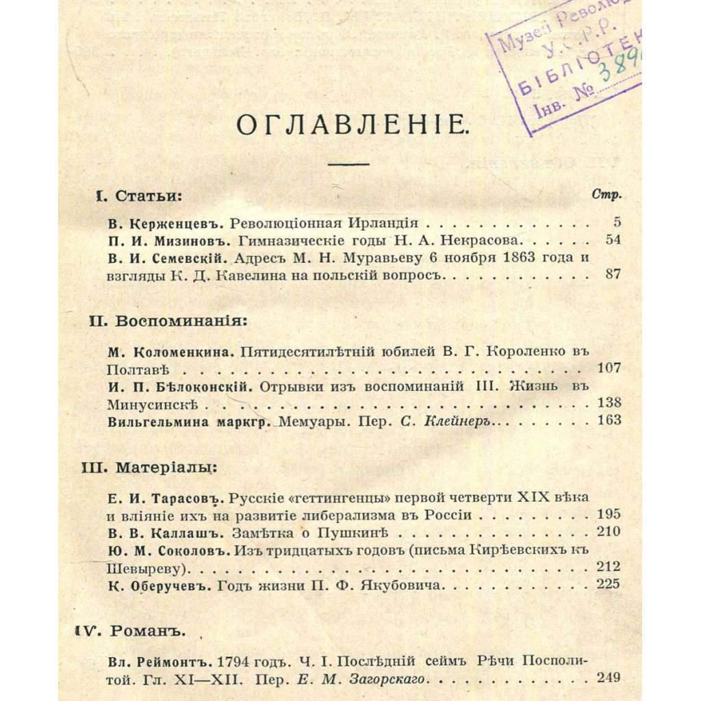 Tři čísla významného ruského historického měsíčníku zaměřeného především na dějiny progresivních hnutí, intelektuálních směrů a literatury Ruska. Do jednoho svazku jsou svázána čísla z dubna, května a června 1914. Viz naskenovaný obsah čísla 4. Celý svazek obsahuje dohromady 8 tabulí s ilustracemi; stránky jsou zdobeny ilustračními a koncovými vinětami.