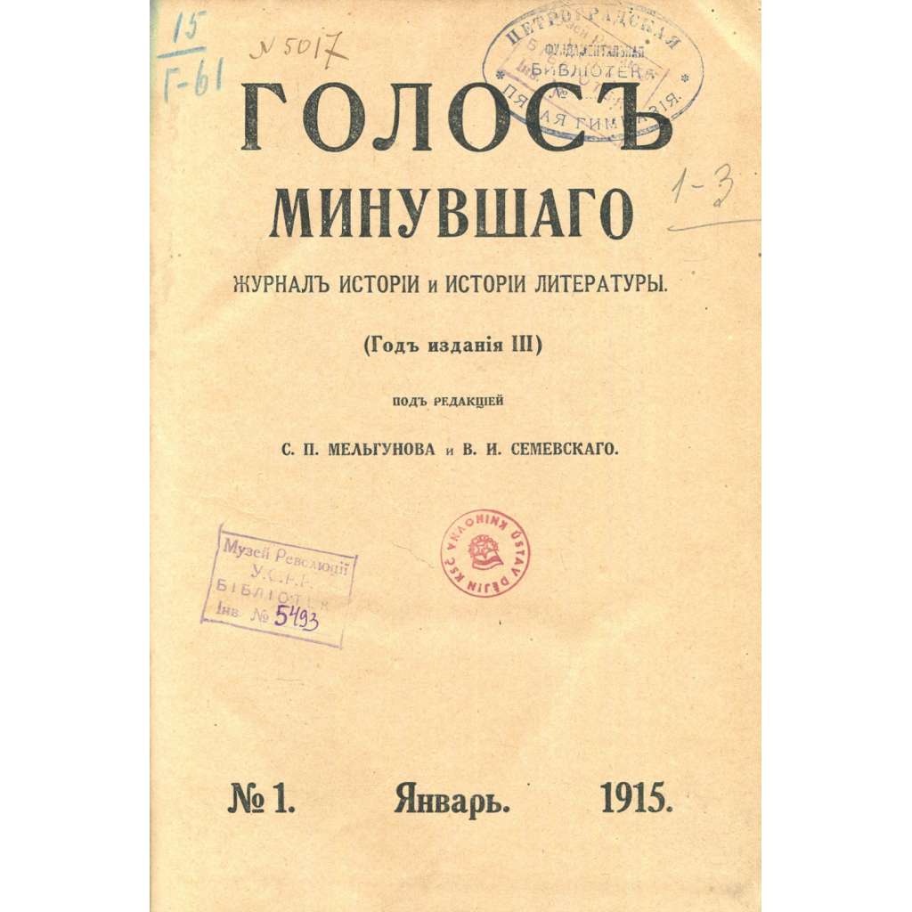 Titul a podtitul: "Голосъ минувшаго. Журналъ исторіи и исторіи литературы" (Golos minuvšago. Žurnal istorii i istorii literatury)