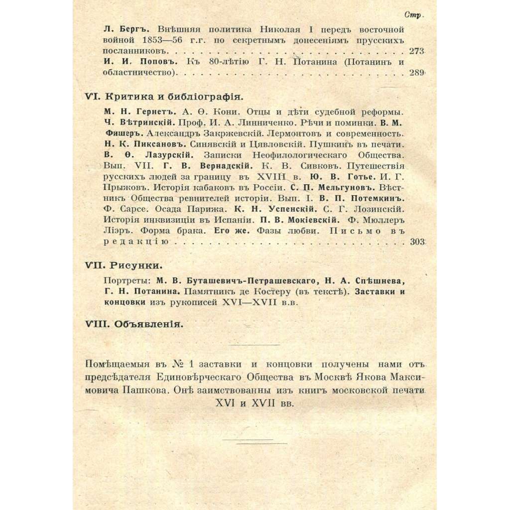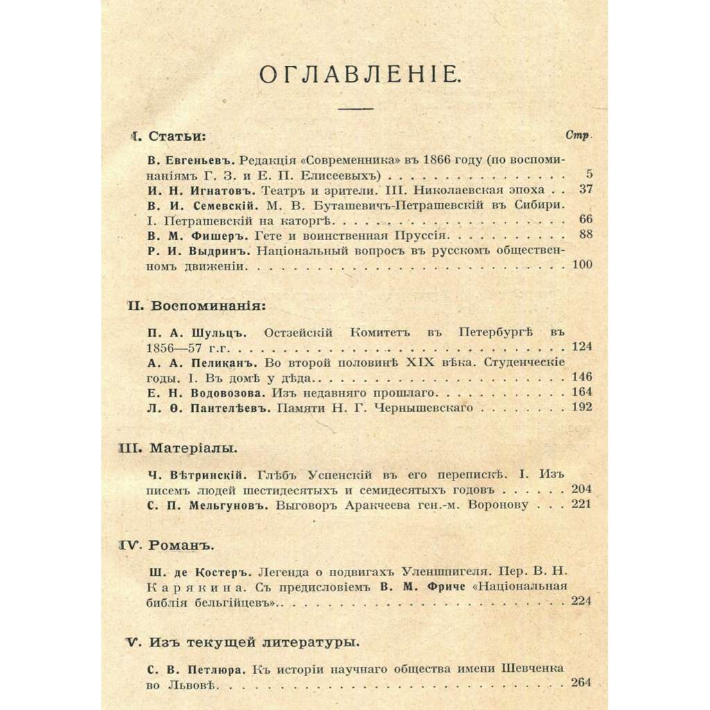 Tři čísla významného ruského historického měsíčníku zaměřeného především na dějiny progresivních hnutí, intelektuálních směrů a literatury Ruska. Do jednoho svazku jsou svázána čísla z ledna, února a března 1915. Viz naskenovaný obsah čísla 1. Celý svazek obsahuje dohromady 7 tabulí s ilustracemi; stránky jsou zdobeny ilustračními a koncovými vinětami.