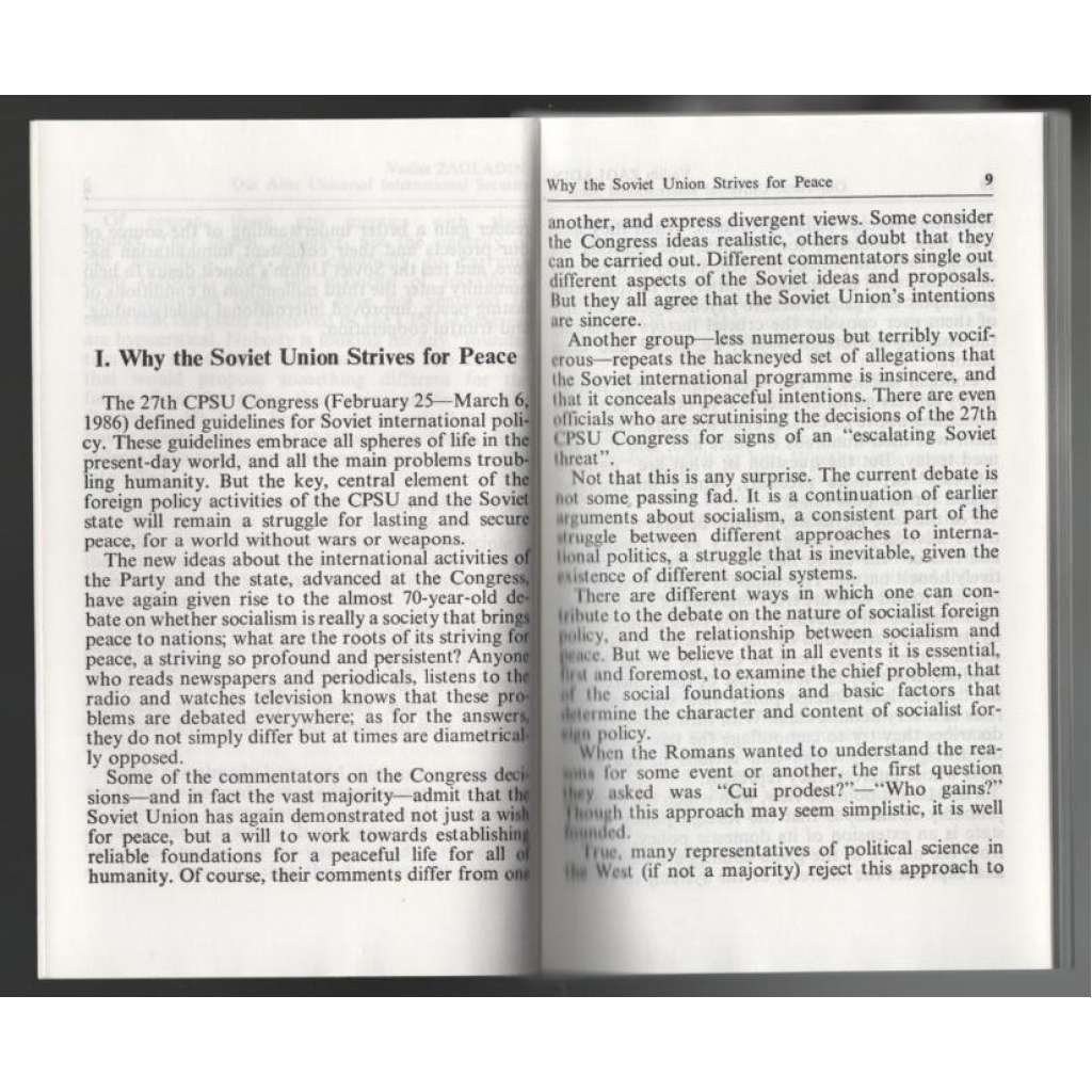 Sovětské mírové snahy, lidstvo v ohrožení, sovětské myšlení v atomovém věku, mezinárodní bezpečnost ve vojenské a politické oblasti, mezinárodní bezpečnost a ekonomické problémy, humanitární aspekty