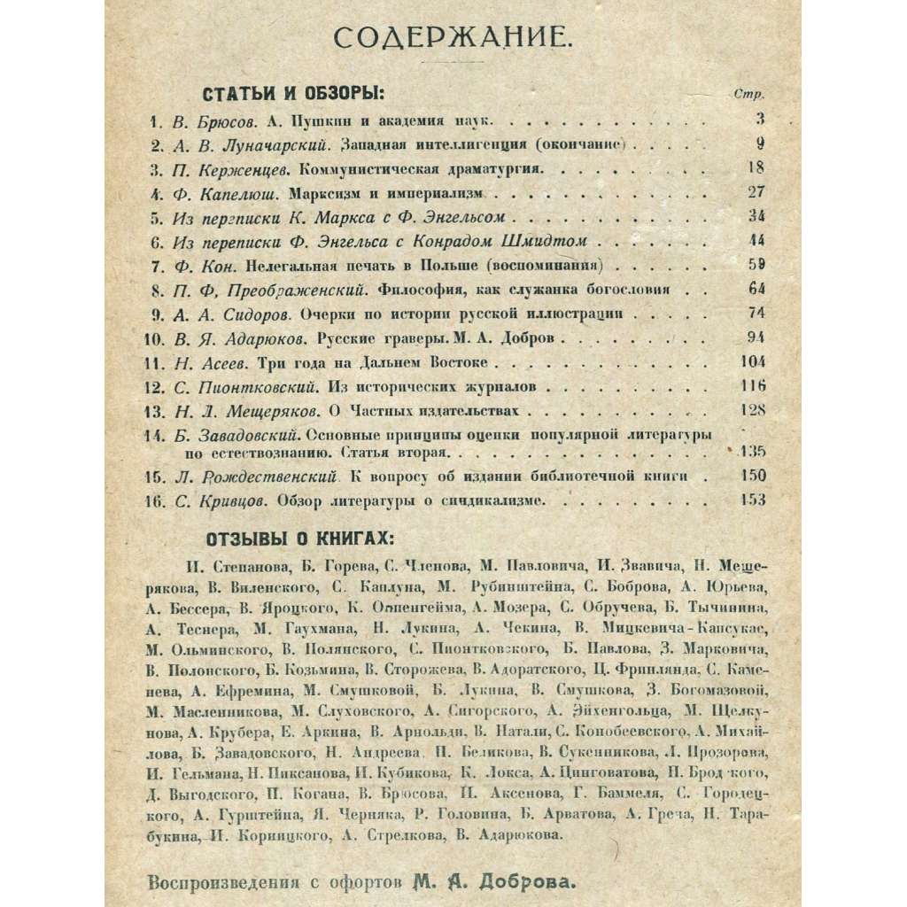 První číslo druhého ročníku sovětského časopisu zaměřeného na literaturu, umění a literární kritiku. Viz naskenovaný obsah. Svazek obsahuje čtyři tabule s barevnými reprodukcemi dřevořezů Anny P. Ostroumovové-Lebeděvové (1871–1955). V textu jsou další ilustrace, stránky jsou zdobeny vlysy a vinětami.