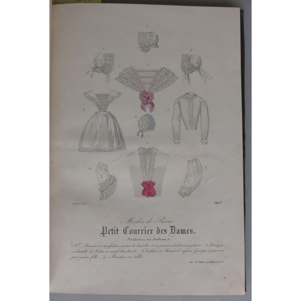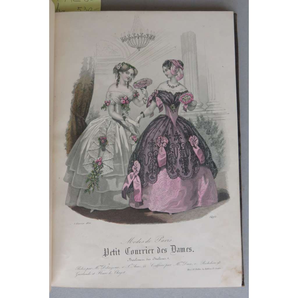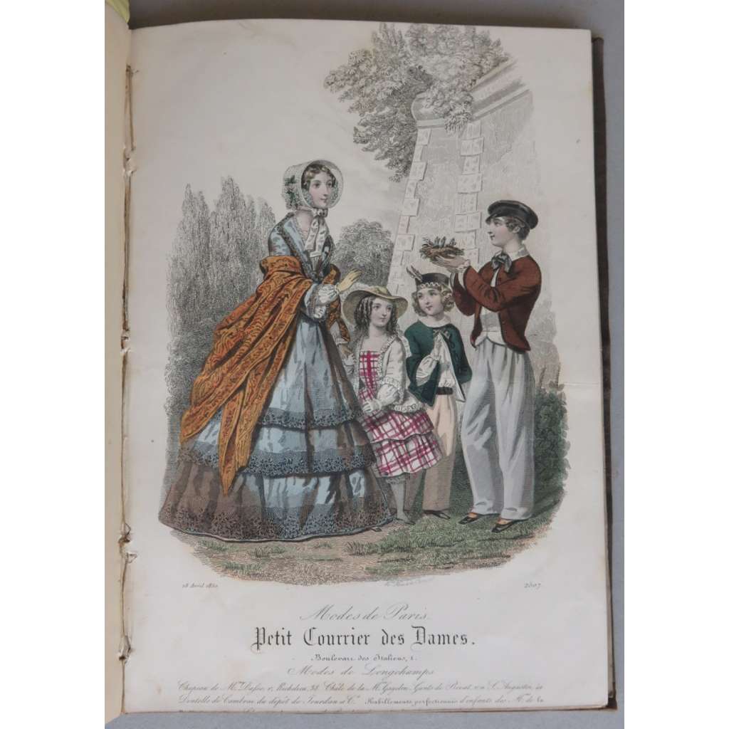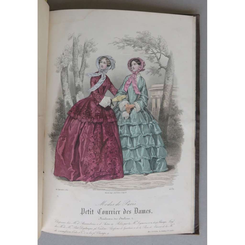 Vydání: Paris 1850, celoplátěná dobová vazba se zlaceným hřbetem, 37 tabulí s "Modes de Paris", č. 2489-2494, 2496-2501, 2503-2507, 2509-2510, 2514-2519 (dvě různé tabule s č. 2516), 2522-2534, většina tabulí kolorovaných, pouze č. 2525 a 2530 černobílé, 4° (19 x 27 cm)