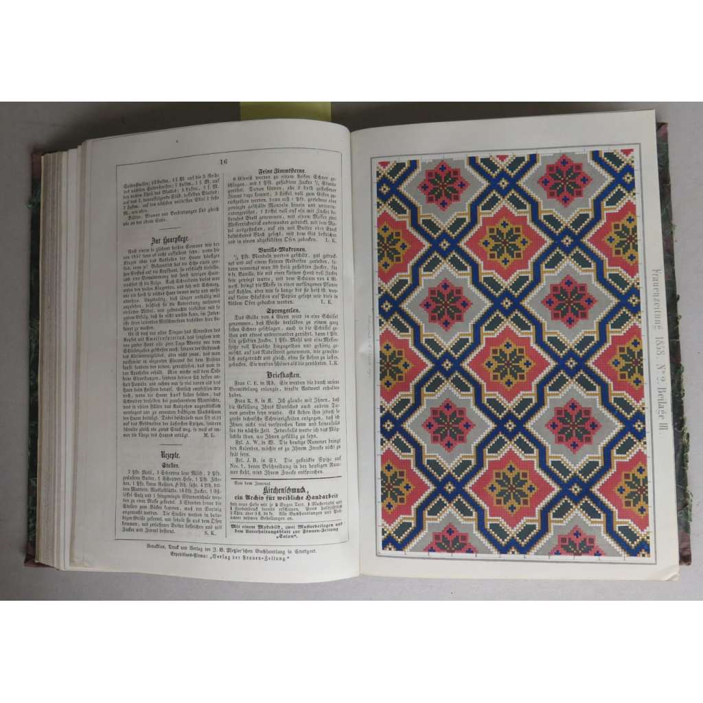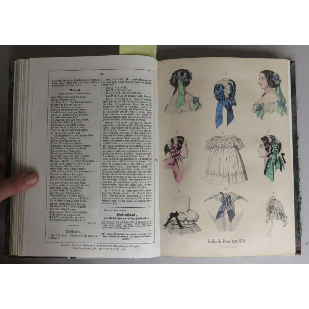 Stav knihy: okraje desek odřené, některé stránky poněkud zahnědlé, obsahuje ilustrace s módou, z "Allgemeinen Muster-Zeitung" z 1. 1. 1857, chybí ilusrace k č. 20 a 24 (6. ročník) a k č . 5 (7. ročník), bez vzorů a většiny příloh, celkově dobrý stav
