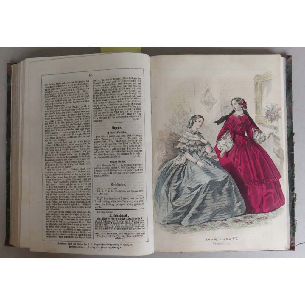 Frauen-Zeitung für weibliche Arbeiten, Moden und Hauswesen; sechster und siebenter Jahrgang, 1857-1858 [domácí práce, móda, kolorované rytiny, staré tisky]